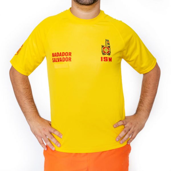 A camisola de manga curta, é de polyester micro perfurado, de cor amarela, e tem as seguintes características: