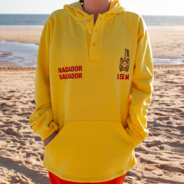 > Na parte traseira superior central, tem a inscrição “NADADOR SALVADOR” em forma circular acompanhando os ombros e imediatamente por baixo a palavra “LIFEGUARD”, gravadas a vermelho.